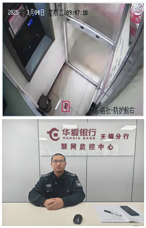 3月4日晚,駐華夏銀行無錫分行監(jiān)控中心保安員史建平在巡查視頻監(jiān)控畫面時,敏銳地發(fā)現(xiàn)洛社支行防護艙內(nèi)有異常情況,他把監(jiān)控畫面放大,發(fā)現(xiàn)防護艙內(nèi)有客戶將部分現(xiàn)金遺落在地上。史建平同志立即啟動突發(fā)事件應(yīng)急預案,使用遠程控制按鈕,將艙門鎖閉,以防他人進出。同時,第一時間通知支行工作人員取走現(xiàn)金,妥善保管等待客戶認領(lǐng)。