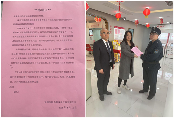 “感謝保安大哥拾金不昧!” 3月11日在華夏銀行無錫分行洛社支行的大廳里,客戶送來感謝信,對保安員宋曉明表示感謝。